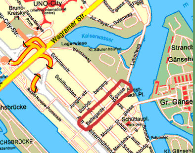 Mit öffentlichen Verkehrsmitteln ist die Bellegardegasse 4 einfach zu erreichen: U1 Station Kaisermühlen, dann mit den Buslinien 90A, 91A, 92A zur Station Schödlbergergasse.